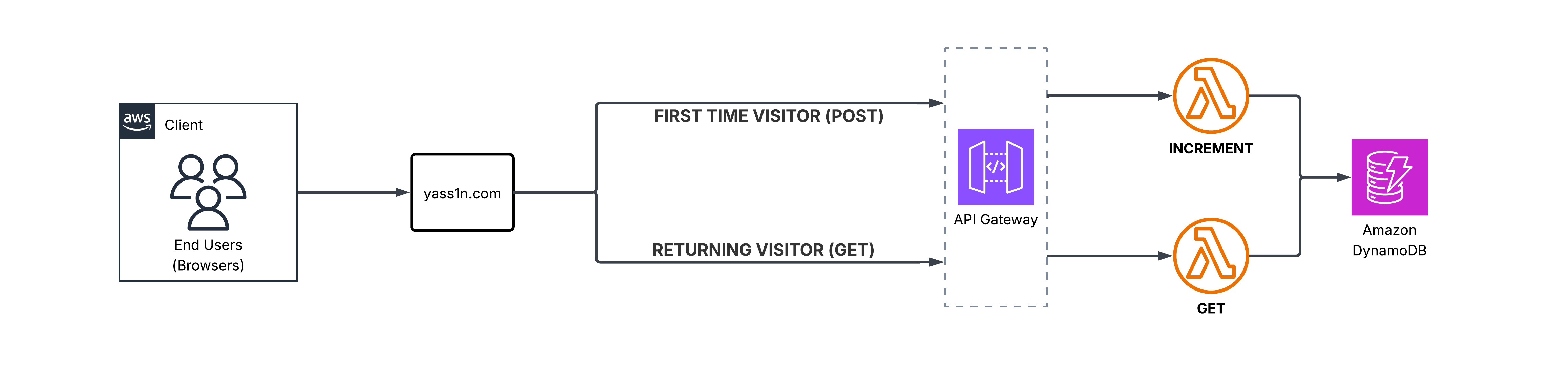 We use JavaScript to call API Gateway when a user loads the website. If the user has visited before, we simply request the view counter from DynamoDB. If it's their first visit, JavaScript submits a POST request, which increments the counter before returning it to the frontend. The JavaScript code that detects whether the user is visiting for the first time is shown below: